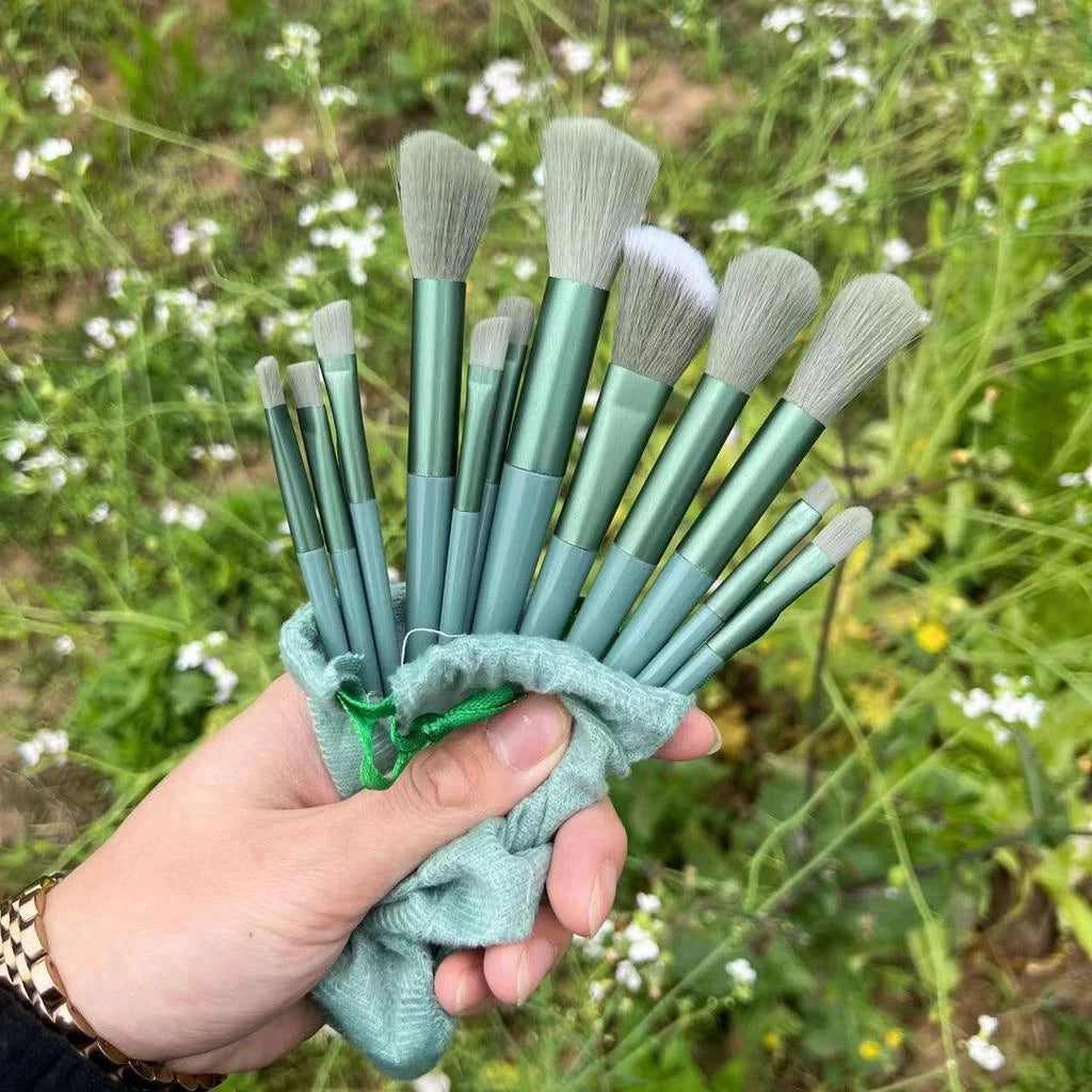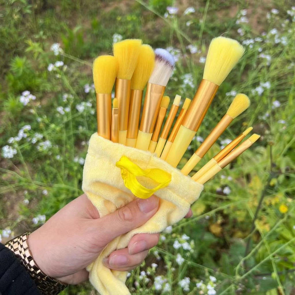 Conjunto de 13 pincéis, incluindo pincel para pó, pincel de base, pincel de sombra, pincel de blush, pincel de iluminador, pincel corretivo, pincel para sobrancelha, pincel para lábios, e bolsinha para guardá-los.