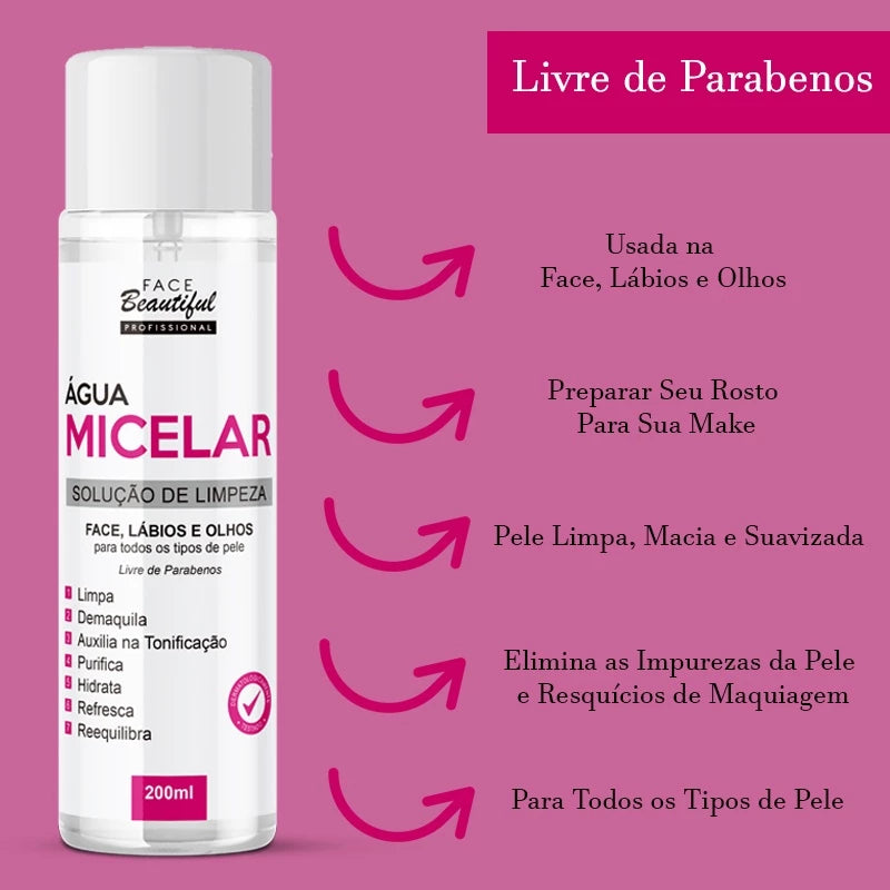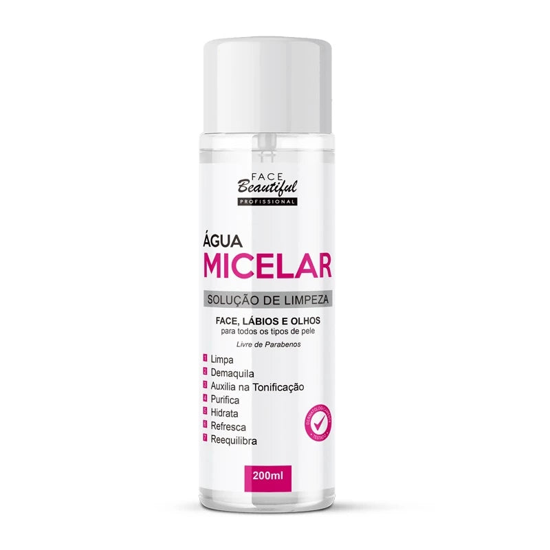 - A Água Micelar da Face Beautiful foi desenvolvida para ajudar na limpeza da pele, removendo resíduos de maquiagem, abrindo as micelas de dentro para fora, sem obstruir os poros, equilibrando o pH e diminuindo a oleosidade.