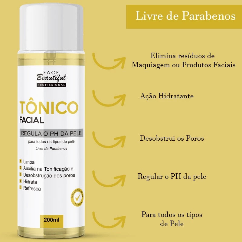 - O Tônico Facial da Face Beautiful foi desenvolvida para regular o PH da pele, ação hidratante, desobstrui os poros e também elimina resíduos de maquiagem ou produtos faciais, que o sabonete não consegue retirar.