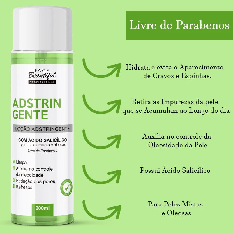 - O Adstringente da Face Beautiful Hidrata e evita o aparecimento de cravos e espinhas, além de retirar as impurezas da pele que se acumulam durante o dia. Características: - Limpa e Refresca a Pele - Auxilia no controle da oleosidade - Redução dos Poros - Para Peles Mistas e Oleosa.