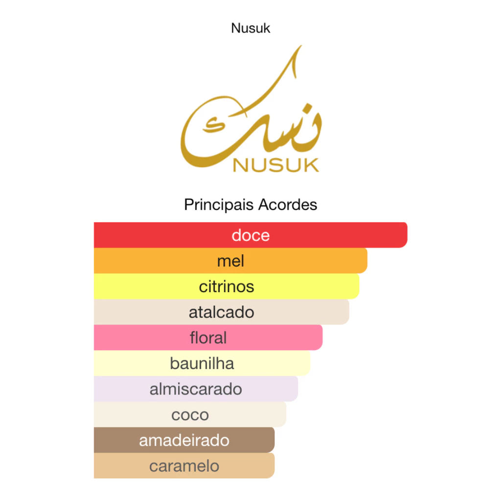 Raheeq Nusuk é aquele gourmand doce e sensual que parece ter sido feito pra quem ama perfumes intensos, cremosos e super desejados. Um abraço de mel, caramelo e baunilha, com toque cítrico e cremoso de coco, que rende muitos elogios e facilmente vira perfume assinatura.